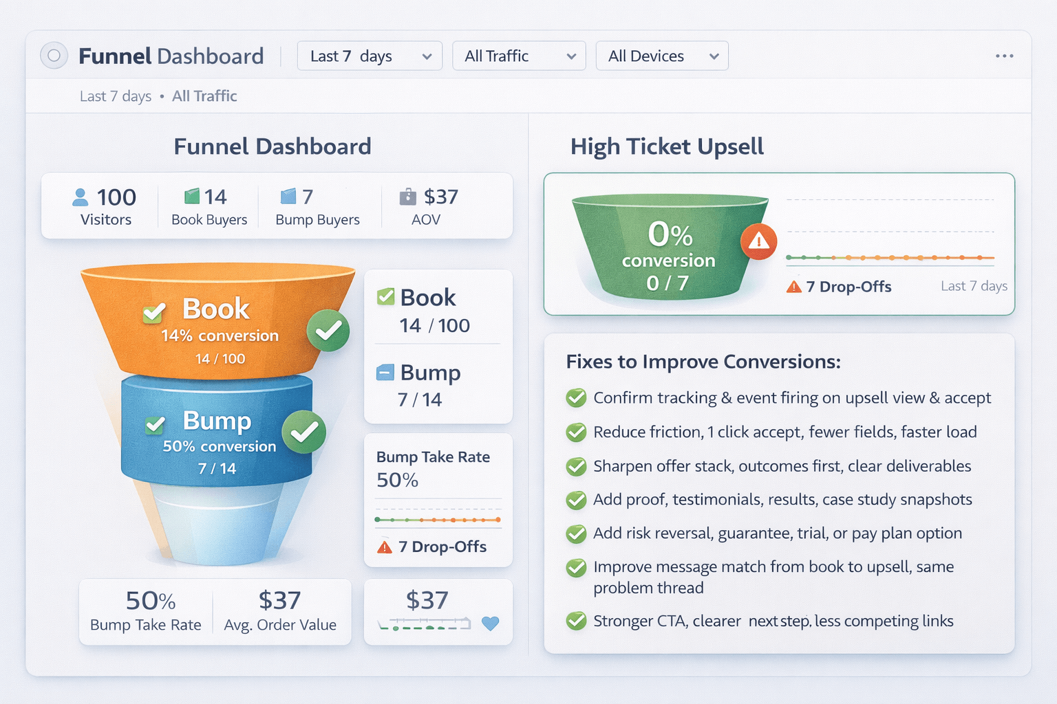 - High ticket upsell is at zero, which signals a mismatch in timing, positioning, or friction.
